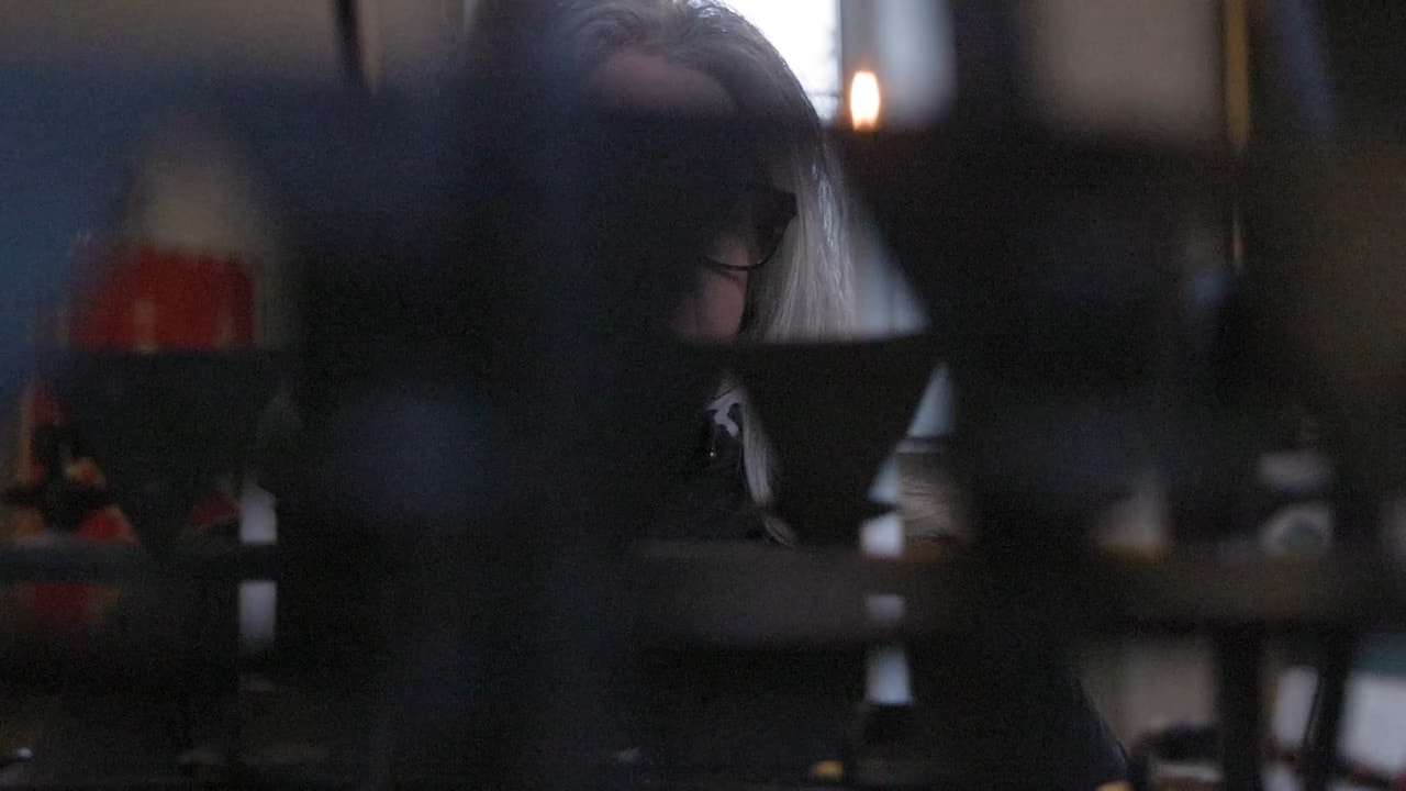 Anna går fram till en svart byrå.